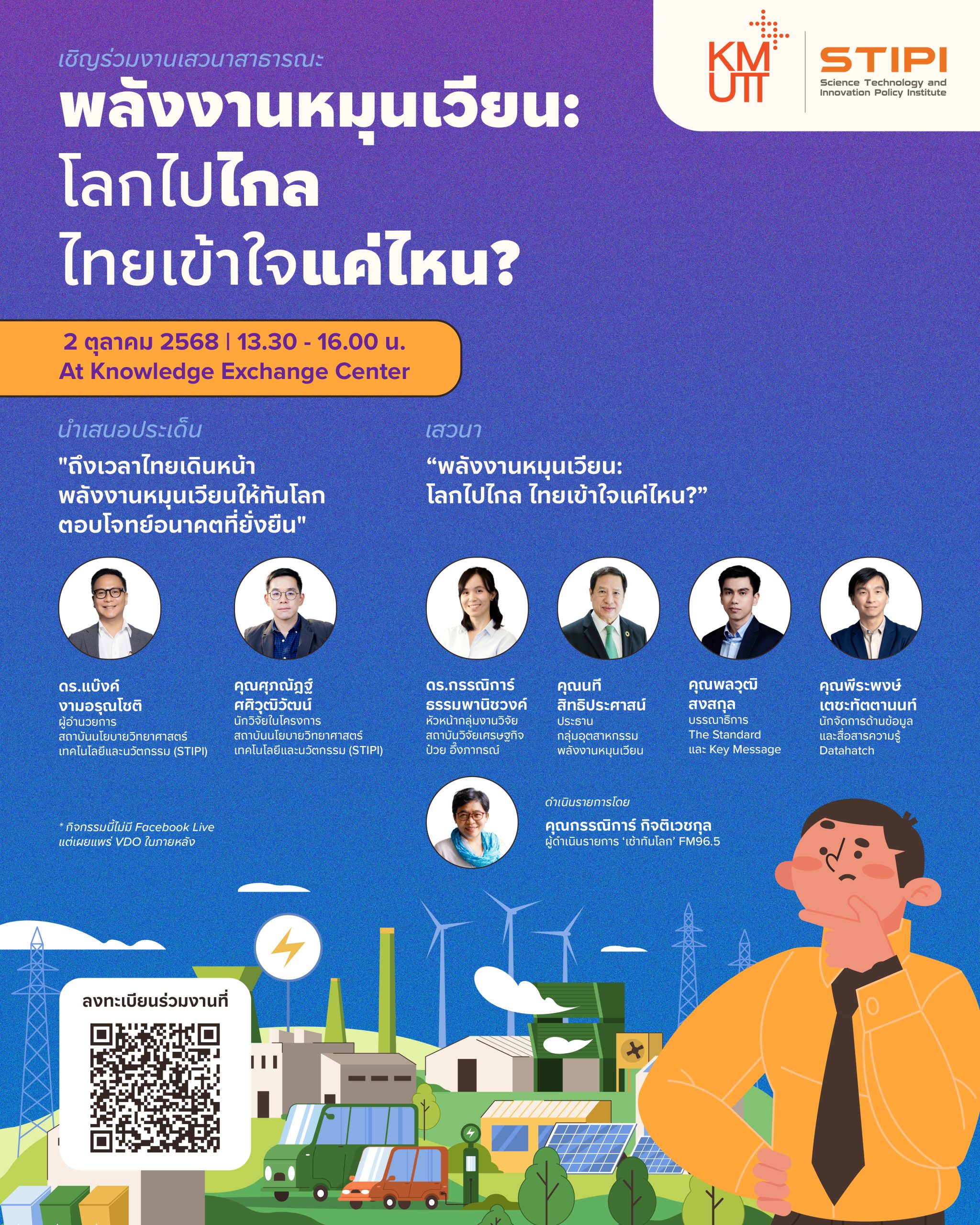 วันที่ 2 ตุลาคม 2568 สถาบันนโยบายวิทยาศาสตร์ เทคโนโลยีและนวัตกรรม (STIPI) จัดเวทีสาธารณะเพื่อเปิดพื้นที่ให้ประชาชนและผู้สนใจร่วมรับฟัง แลกเปลี่ยน และตั้งคำถามต่อ “อนาคตพลังงานของประเทศ” โดยภายในงานมีการนำเสนอประเด็นสำคัญ “ถึงเวลาไทยเดินหน้าพลังงานหมุนเวียนให้ทันโลก ตอบโจทย์ยั่งยืนที่ต้องขับเคลื่อน” โดย ดร.แบ๊งค์ งามอรุณโชติ ผู้อำนวยการสถาบันฯ และ คุณศุภณัฏฐ์...