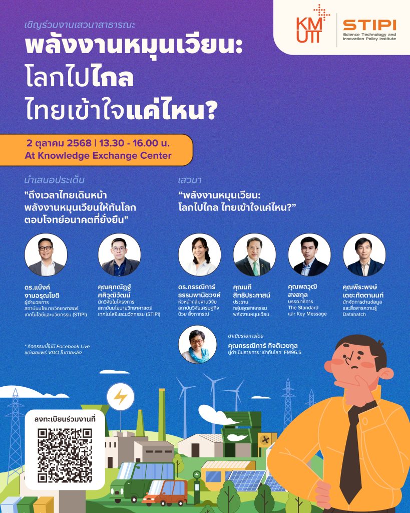 STIPI ขอเชิญร่วมงานเสวนาสาธารณะ พลังงานหมุนเวียน: โลกไปไกล ไทยเข้าใจแค่ไหน? โลกกำลังขยับสู่พลังงานหมุนเวียนอย่างก้าวกระโดด แต่คำถามคือ… สังคมไทยเข้าใจและพร้อมก้าวตามแค่ไหน? STIPI ขอเชิญร่วมงานเสวนาสาธารณะ“พลังงานหมุนเวียน: โลกไปไกล ไทยเข้าใจแค่ไหน?” 🗓 วันพฤหัสบดีที่ 2 ตุลาคม 2568🕑 เวลา 13.30 – 16.00 น.📍 อาคาร KX ชั้น 10 ห้อง X04Aงานเสวนาครั้งนี้จัดโดย สถาบันนโยบายวิทยาศาสตร์ เทคโนโลยีและนวัตกรรม (STIPI) และ KMUTT เปิดเวทีให้สาธารณะร่วมฟัง แลกเปลี่ยน และตั้งคำถามต่ออนาคตพลังงานของประเทศนำเสนอประเด็น “ถึงเวลาไทยเดินหน้าพลังงานหมุนเวียนให้ทันโลก ตอบโจทย์ยั่งยืนที่ต้องขับเคลื่อน”โดย ดร.แบ๊งค์ งามอรุณโชติ – ผู้อำนวยการสถาบันนโยบายวิทยาศาสตร์ เทคโนโลยีและนวัตกรรม (STIPI) และ คุณศุภณัฏฐ์ ศศิวุฒิวัฒน์ – นักวิจัยในโครงการเสวนา “พลังงานหมุนเวียน: โลกไปไกล ไทยเข้าใจแค่ไหน?”ร่วมแลกเปลี่ยนโดย● ดร.กรรณิการ์ ธรรมพานิชวงศ์ – หัวหน้ากลุ่มงานวิจัย […]