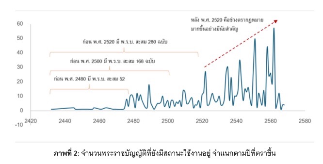 กฎหมายของประเทศไทยจำนวนมากขาดการทบทวน แม้จะมีอายุมากและไม่ค่อยถูกใช้งาน ตัวอย่างเช่น พระราชบัญญัติราว 52 ฉบับหรือคิดเป็น 5.4% ของ พ.ร.บ. ทั้งหมดมีอายุมากกว่า 89 ปี และหากนับพระราชบัญญัติที่มีอายุมากกว่า 69 ปี จะพบว่ามีจำนวนมากถึง 280 ฉบับหรือกว่า 29% ของจำนวน พ.ร.บ. ทั้งหมด ข้อมูลนี้สะท้อนว่า กฎหมายระดับ พ.ร.บ. เกือบ 1/3 ถูกร่างไว้นานมากแล้ว อาจไม่สอดคล้องกับบริบทโลกในปัจจุบัน (ดูภาพที่ 2)