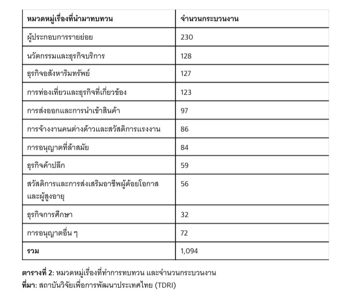 TDRI เคยประเมินว่าประเทศไทยมีใบอนุญาตมากกว่า 1,400 ใบ และมีการบังคับขออนุญาตมากเกินไป เช่น การเปิดร้านอาหารหนึ่งให้ถูกต้องครบถ้วนร้านต้องขอใบอนุญาต 2-6 ใบ[8] หรือการทำอสังหาริมทรัพย์ต้องติดต่อ 22 หน่วยงานและขอใบอนุญาต 15 ใบ[9] เป็นต้น