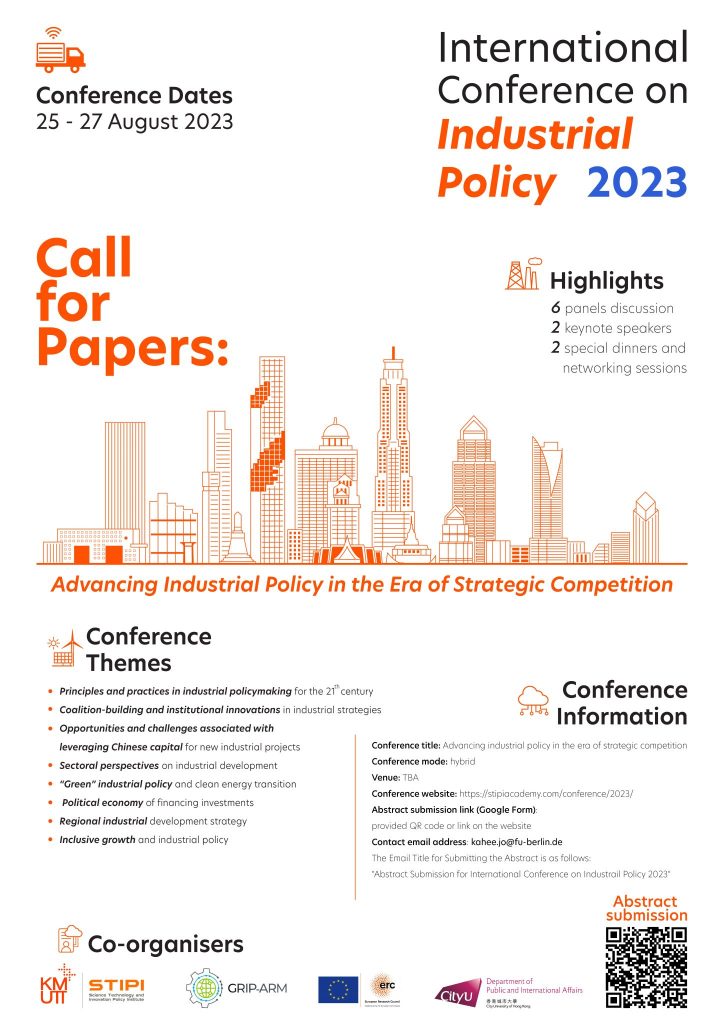 Dates: 25 – 27 August 2023The conference will be held in Bangkok, Thailand which is co-sponsored by the Science, Technology and Innovation Policy Institute (STIPI), King Mongkut’s University of Technology Thonburi (KMUTT), and the ERC Starting Grant research programme Green Industrial Policy in the Age of Rare Metals (GRIP-ARM) under Grant No. 9590056. To participate in the workshop, please send a 500-word (maximum) abstract via this Google Form by 28 April 2023. We will send individual emails of acceptance/rejection by 12 May 2023. Full papers between 5,000 – 7,000 words are expected to be submitted on 21 July 2023. We will release the final programme four weeks before the conference.